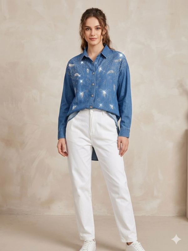 Denim Shirt “Pearl & Shine” – Διαχρονικό Τζιν με Glam Λεπτομέρειες