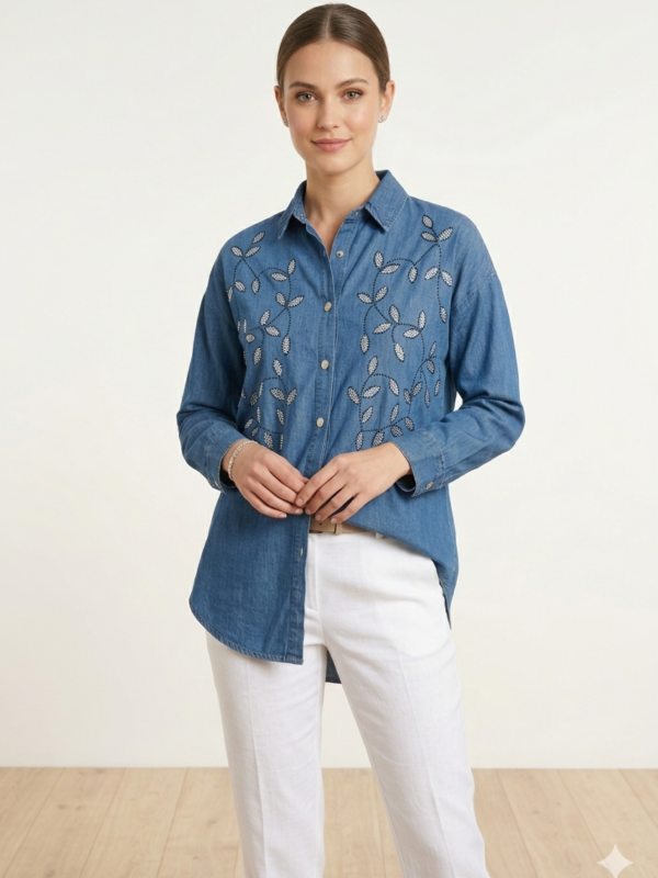 Denim Πουκαμίσα με Κεντημένα Φύλλα & Στρας