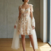 Floral Accents: Το εντυπωσιακό υφασμάτινο λουλούδι στη μέση σμιλεύει τη σιλουέτα, προσθέτοντας μια artisanal πινελιά που κλέβει τις εντυπώσεις.