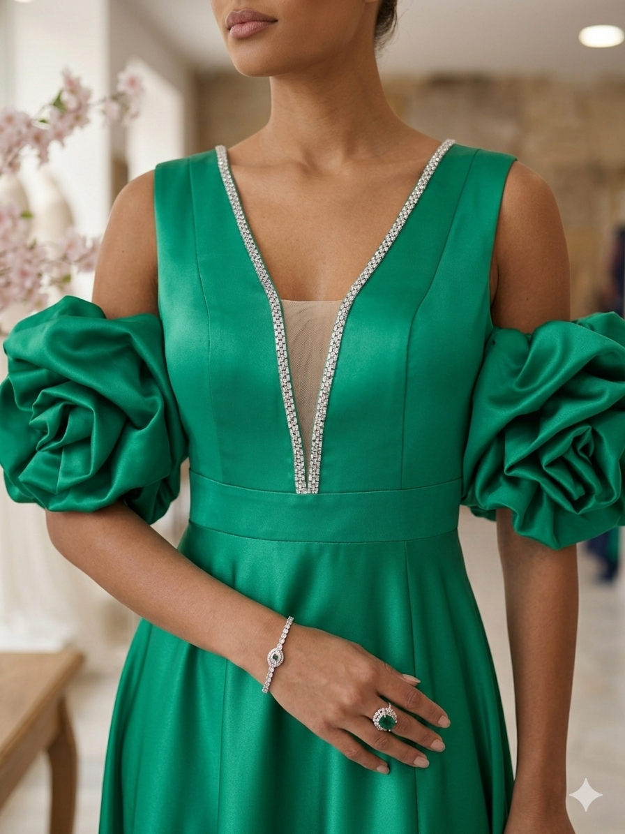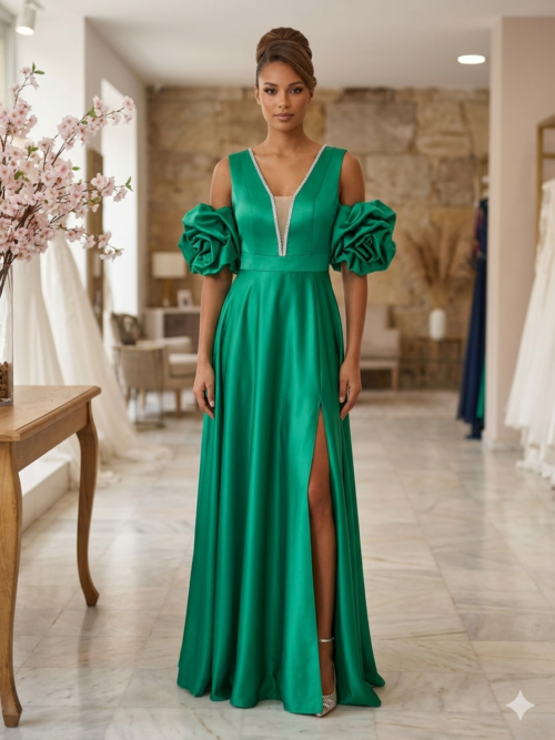 Αναβαθμίστε τη formal συλλογή σας με αυτό το εκπληκτικό σατέν μάξι φόρεμα σε πλούσια σμαραγδί απόχρωση. Σχεδιασμένο για την γυναίκα που αναζητά την απόλυτη ισορροπία ανάμεσα στην κομψότητα, τη θεατρικότητα και την απαράμιλλη άνεση, αυτό το φόρεμα είναι μια δήλωση στυλ για κάθε επίσημη περίσταση.