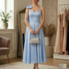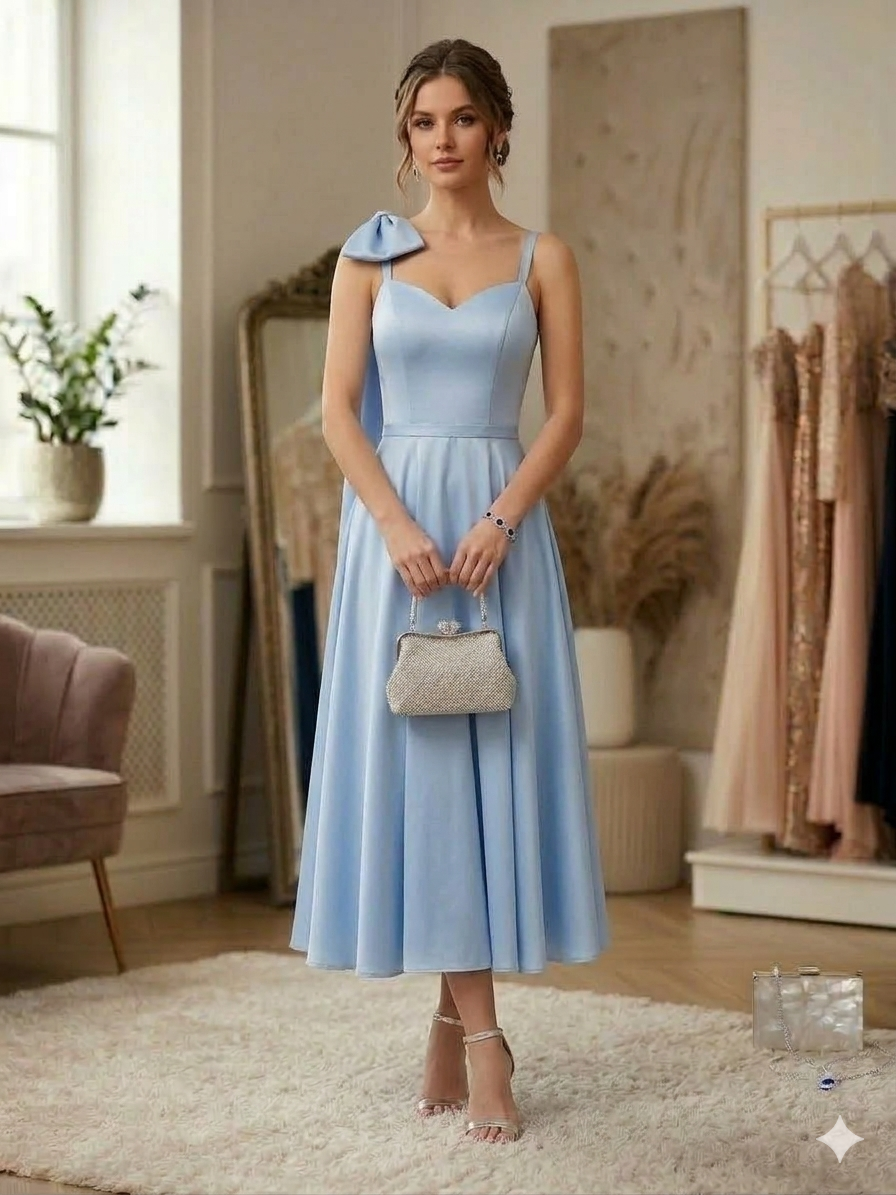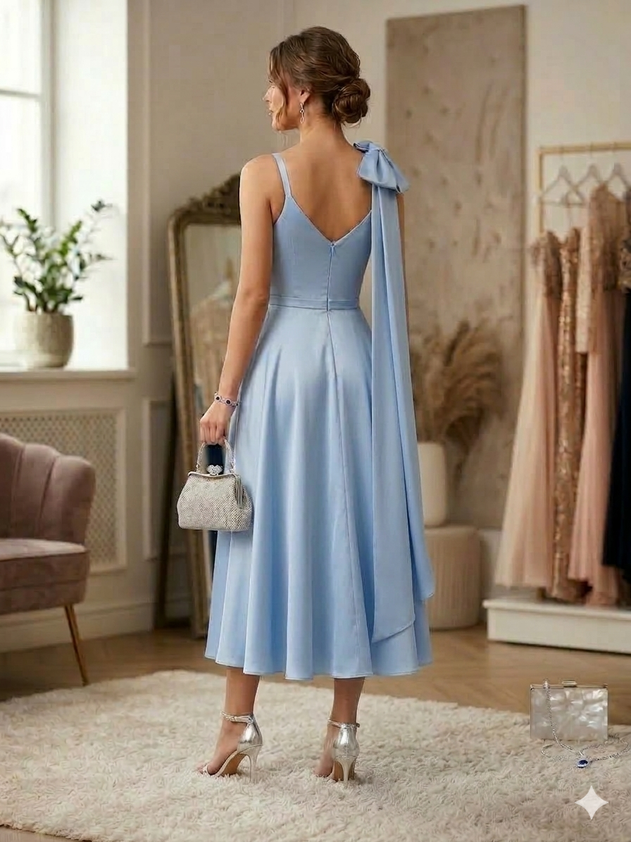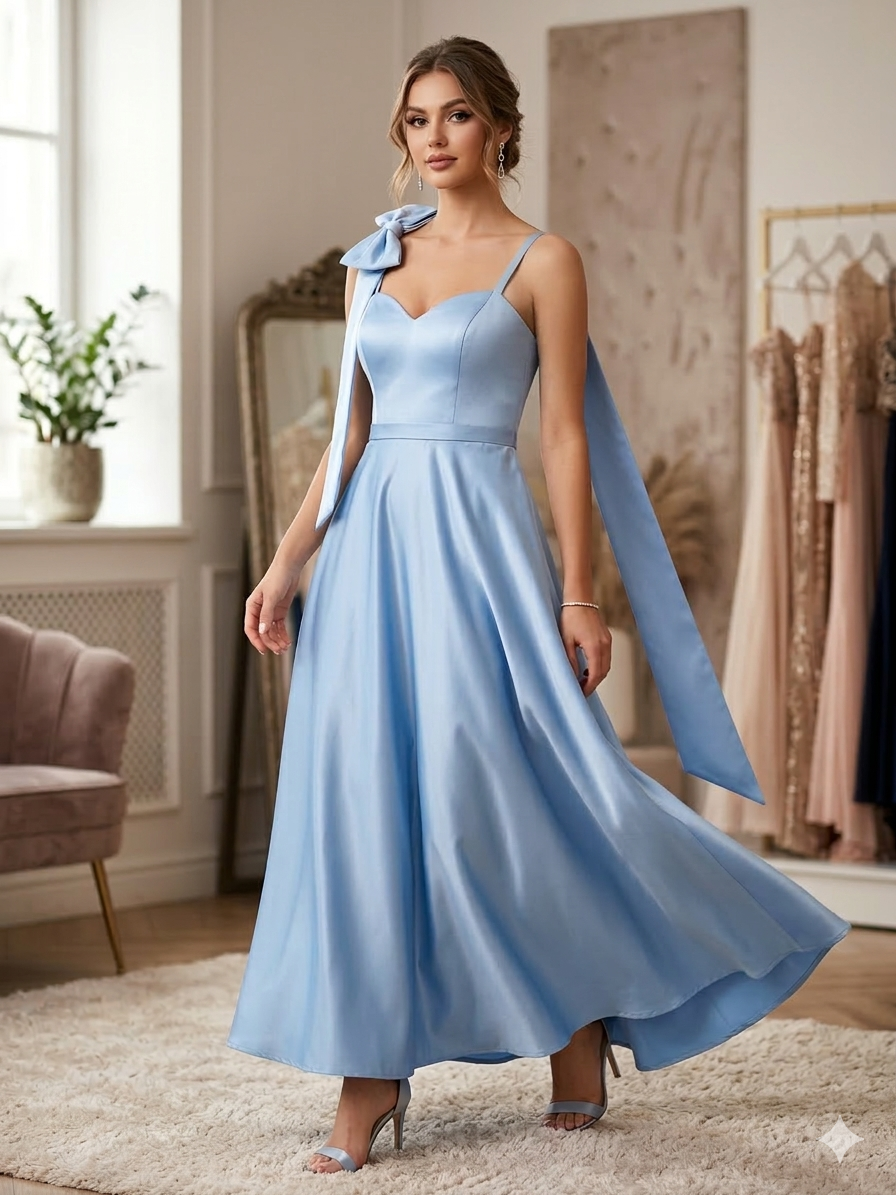 Πρόκειται για ένα εντυπωσιακό και κομψό βραδινό φόρεμα (ball gown) σε μια απαλή γαλάζια απόχρωση (baby blue), κατασκευασμένο από πολυτελές σατέν ύφασμα που αντανακλά το φως με μια διακριτική λάμψη.