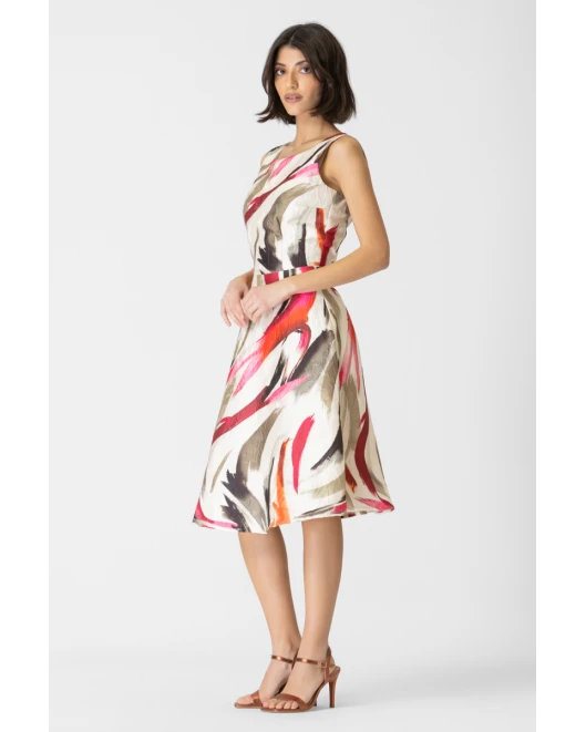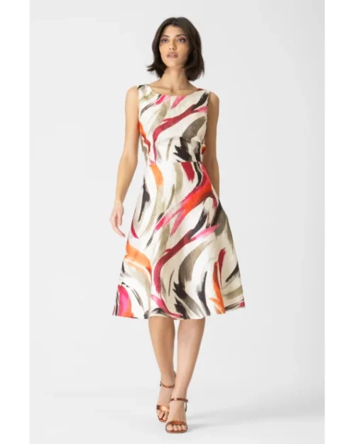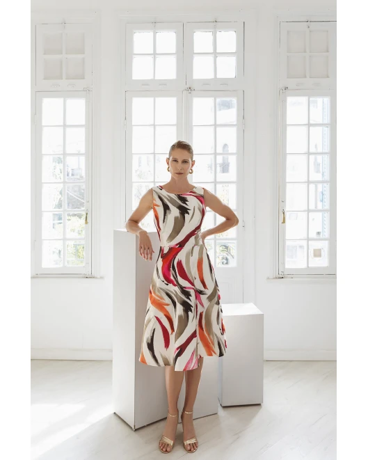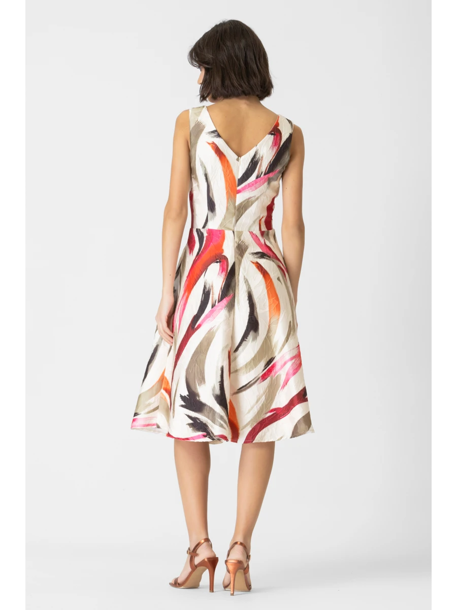 Φόρεμα κλος εμπριμέ ζακάρ Dolore σε ύφασμα ανάγλυφο εμπριμέ. Διαθέτει ελαστική φόδρα εσωτερικά και κρυφό φερμουάρ στην πλάτη. 100% ελληνικής παραγωγής από το 1985.